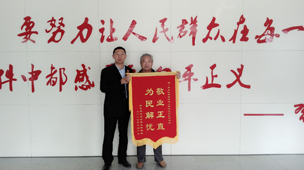 2017年10月25日,还没到上班时间,两位老人早早来到bt365博彩手机版新安法庭,感谢新安法庭法官几经周折将被执行人拖欠几年的欠款全部执行到位。见到法官,老人双手递上了一面锦旗,上书:“敬业正直,为民解忧”八个大字,并说:“我代表我们全家感谢你们新安法庭的法官,这个钱能帮我们要来真是不容易,你们帮我们全家解决了大问题!”另外一位和他一起来的老人还带来了锤子、铁钉,说一定要亲自把这面锦旗挂到法官办公室的墙上……